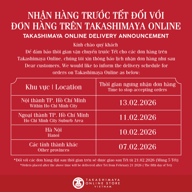 Để đảm bảo thời gian vận chuyển trước Tết cho các đơn hàng trên Takashimaya Online, chúng tôi xin thông báo lịch nhận đơn hàng như sau: