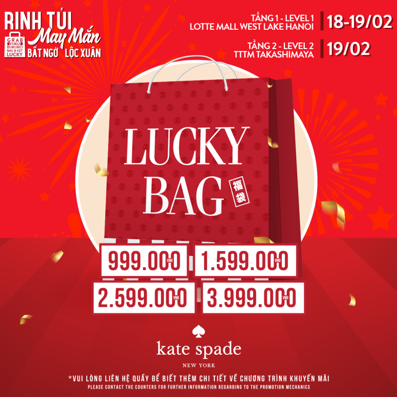 Ngày 19/02 tại Kate Spade TP.HCM và 18–19/02 tại Kate Spade Hà Nội, đừng bỏ lỡ cơ hội sở hữu LUCKY BAG từ Kate Spade New York với những thiết kế xinh xắn, thời thượng cùng mức giá cực hấp dẫn chỉ từ 999.000 – 1.599.000 – 2.599.000 – 3.999.000 VNĐ.