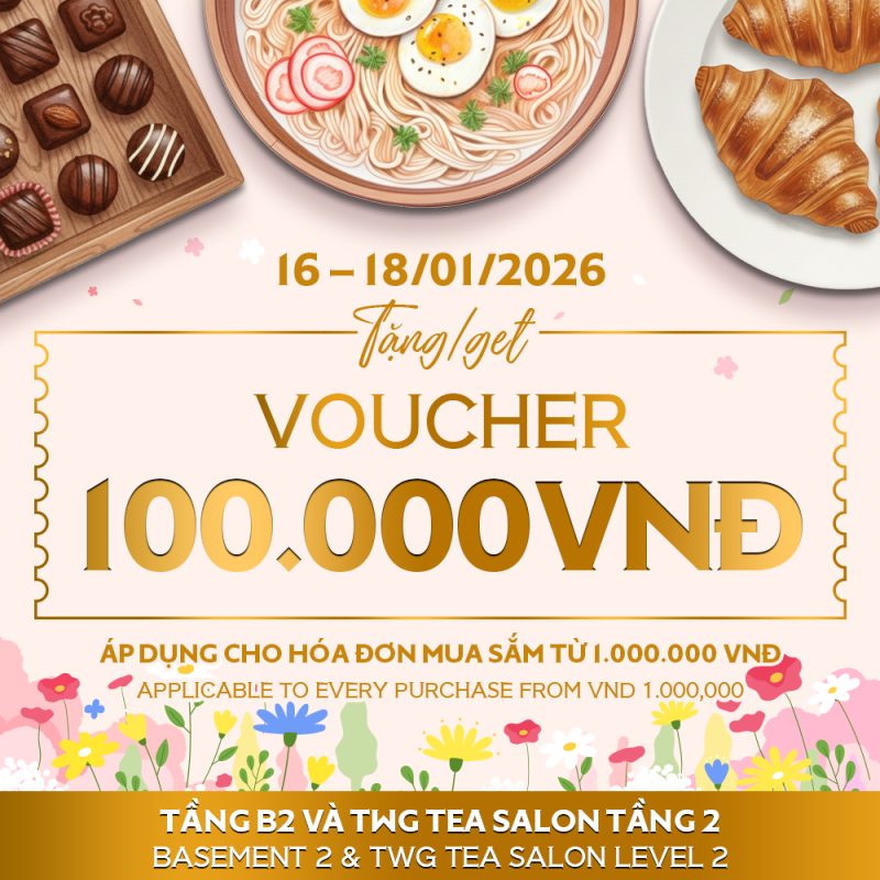 Tặng phiếu quà tặng ẩm thực trị giá 100.000 VNĐ cho hóa đơn từ 1.000.000 VNĐ tại tầng B2 và cửa hàng TWG Tea Salon tại tầng 2, TTTM Takashimaya.