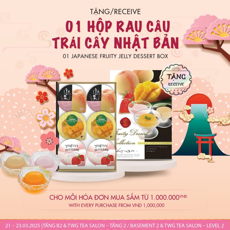 Tặng 01 hộp rau câu trái cây Nhật Bản trị giá 165.000 VNĐ cho mỗi hóa đơn mua sắm từ 1.000.000 VNĐ tại tầng B2 và cửa hàng TWG Tea Salon tại Tầng 2, TTTM Takashimaya