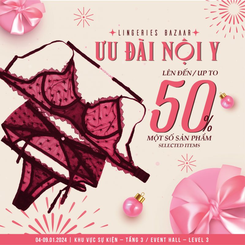 Ưu đãi lên đến 50% cho một số sản phẩm nội y & phụ kiện thuộc các thương hiệu như: Triumph, Vera, Copenhagen Delights, Bare, Corele V, Mustoto, Pierre Cardin, Energized, Sorella, Young Curves, Young Hearts, Seduce, Speranza, Annie, Wannabe, Lan Hạnh.