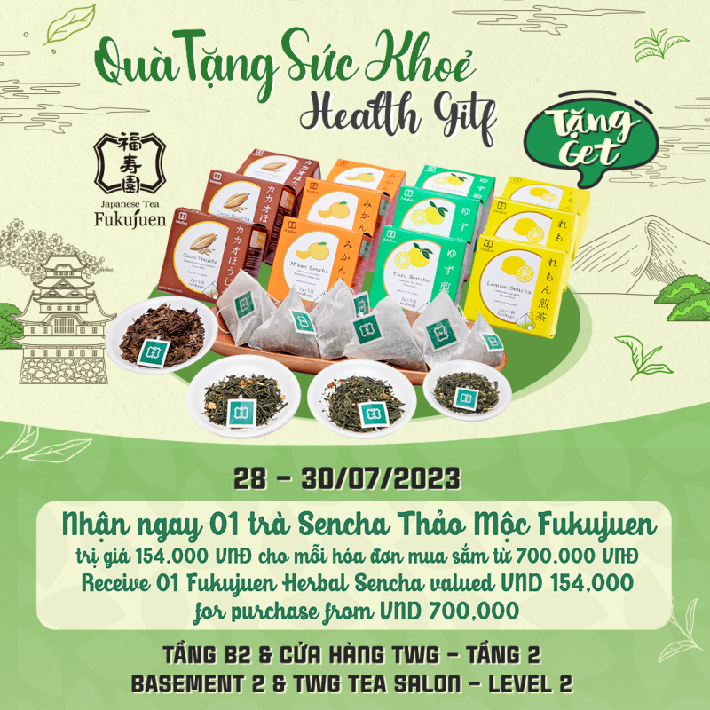 Tặng 01 trà Sencha Thảo mộc Fukujuen trị giá 154.000vnđ cho mỗi hóa đơn mua sắm từ 700.000 vnđ tại tầng B2, TTTM Takashimaya