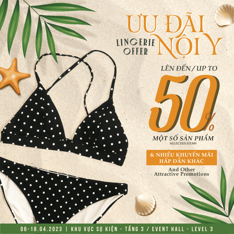 Giảm giá lên đến 50% cho một số sản phẩm & nhiều khuyến mãi hấp dẫn khác từ các thương hiệu nội y, đồ ngủ, đồ mặc nhà như: Triumph, Vera, Corele V, Energized, Marguerite, Mustoto, Pierre Cardin, Seduce, Sorella, Speranza, Young Curves, Wannabe, Lan Hanh, Thu Boutique.