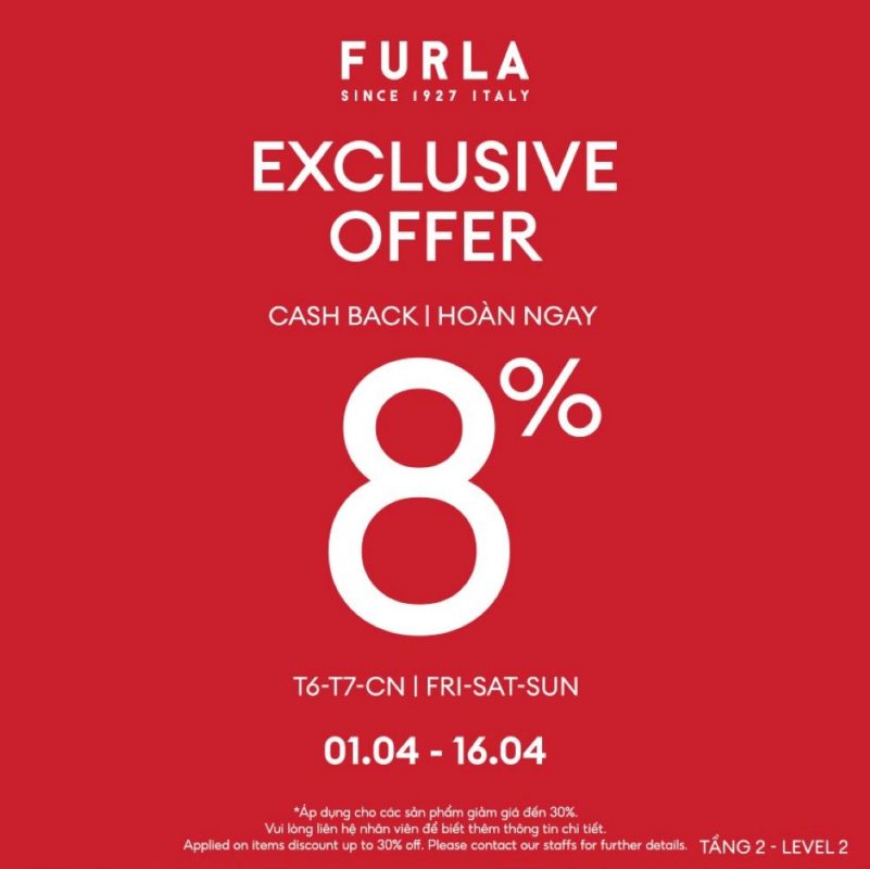 Chương trình áp dụng vào các ngày cuối tuần, T6-T7-CN từ ngày 01/04 – 16/04/2023. Đặc biệt, rất nhiều sản phẩm mới về đã sẵn sàng lên kệ, hãy đến và khám phá tại FURLA ngay nàng nhé!