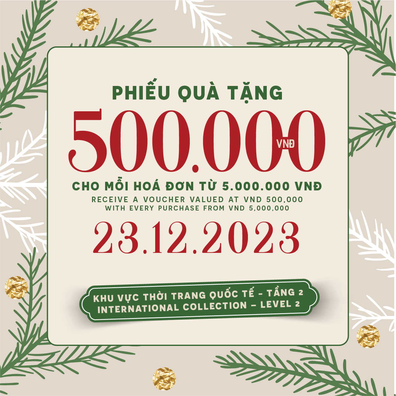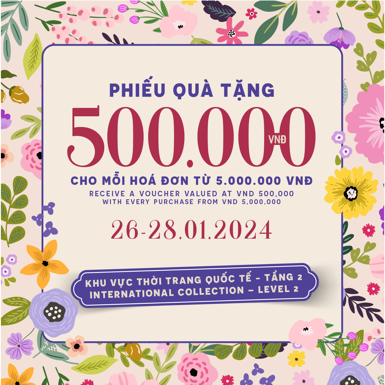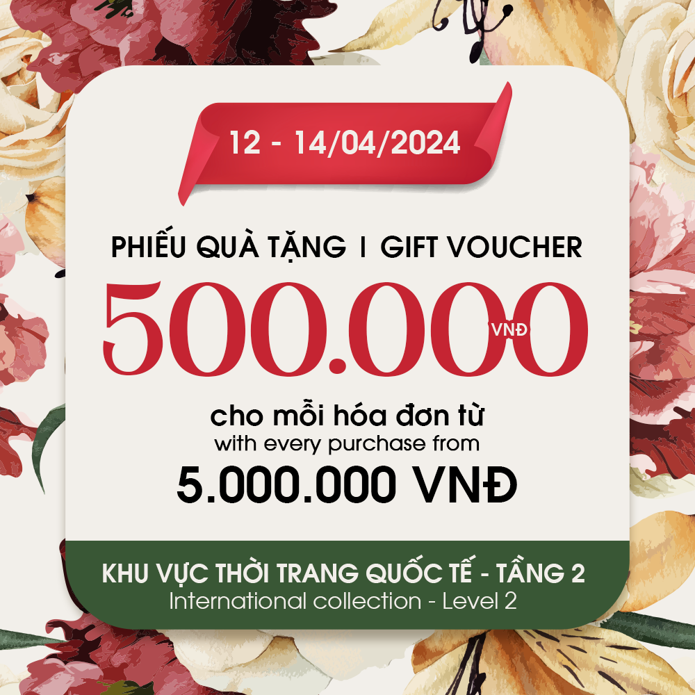 TẶNG NGAY PHIẾU QUÀ TẶNG TRỊ GIÁ 500.000 VNĐ CHO MỖI HÓA ĐƠN TỪ 5.000.000 VNĐ TẠI KHU VỰC THỜI TRANG QUỐC TẾ, TẦNG 2/RECEIVE A VOUCHER VALUED AT VND 500,000 WITH EVERY PURCHASE FROM VND 5,000,000 AT THE INTERNATIONAL COLLECTION, LEVEL 2