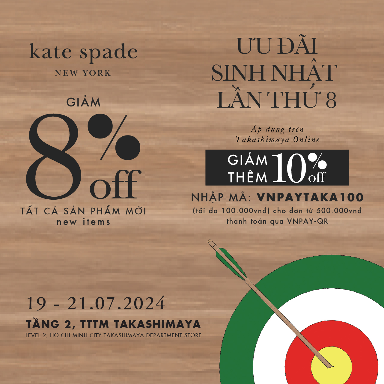 ƯU ĐÃI SINH NHẬT LẦN THỨ 8 Mừng 8 năm sinh nhật Takashimaya, Kate Spade New York giảm giá 8% cho tất cả sản phẩm mới. Time: 19 – 21/07/2024 Xem thêm tại: https://bit.ly/KSNY_UuDaiSinhNhat Cùng sắm những items mới nhất của Kate Spade New York tại: Kate Spade New York, Tầng 2, TTTM Takashimaya Kate [...]